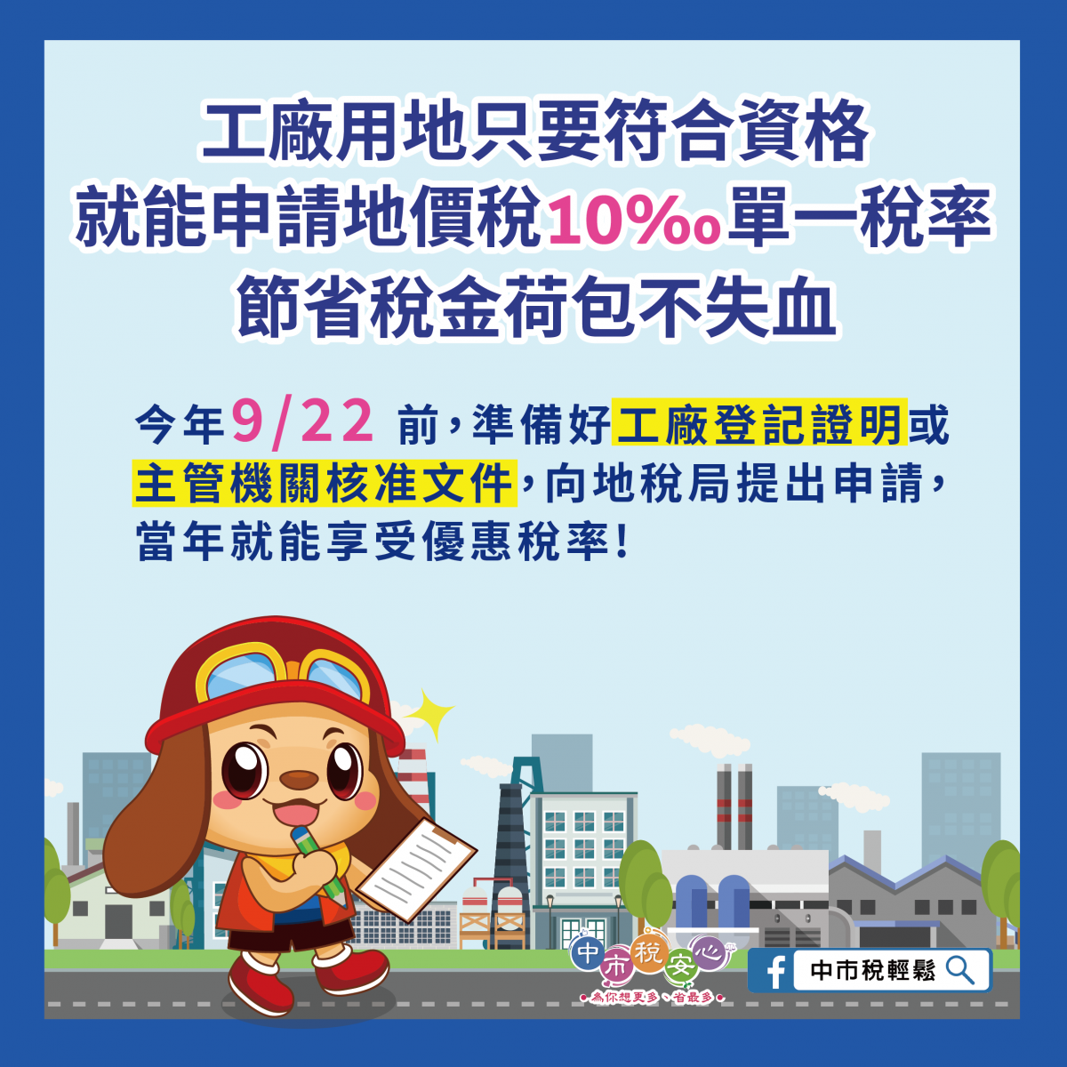 工廠用地只要符合資格就能申請地價稅10‰單一稅率